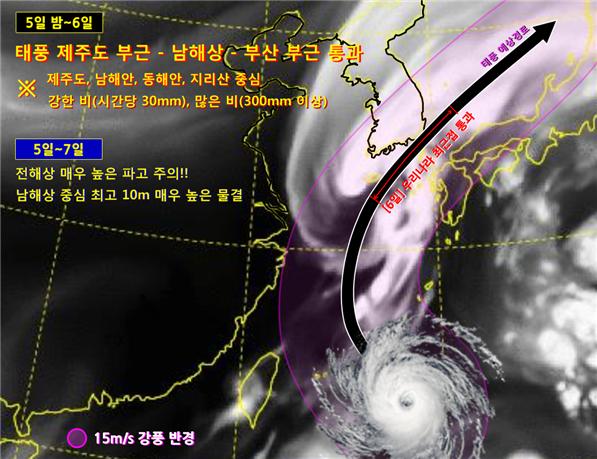 □ 특히, 5일(금)~7일(일)에는 태풍의 예상 이동경로에 가장 가까운 제주도와 남해안, 동해안, 지리산 부근을 중심으로 강풍과 천둥번개를 동반한 시간당 30mm 이상의 강한 비가 내리겠고, 300mm 이상의 매우 많은 비가 내리겠음. 그 밖의 전국에서도 100mm 이상의 많은 비가 오는 곳이 있겠으니, 비 피해로 인한 안전사고에 각별히 유의하기 바람.