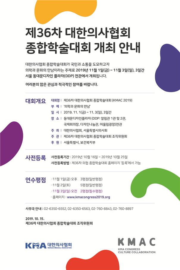 대한의사협회 종합학술대회 조직위원회(회장 최대집, 공동조직위원장 박정율 ․ 박홍준)는 2019. 11. 1.(금) ~ 3.(일)까지 3일간 동대문디자인플라자(DDP)에서 ‘의학과 문화의 만남’이라는 주제로 제36차 대한의사협회 종합학술대회를 개최한다고 밝혔다.