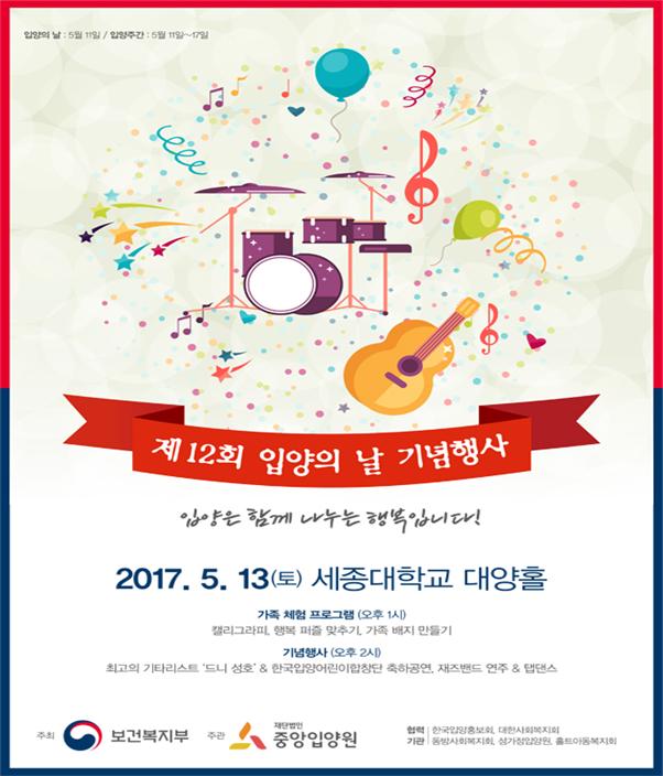 보건복지부(장관 정진엽)는 5월 13일(토) 오후 2시, 세종대학교 대양홀에서 「2017년 제12회 입양의 날 기념행사」를 개최한다(주관: 중앙입양원).