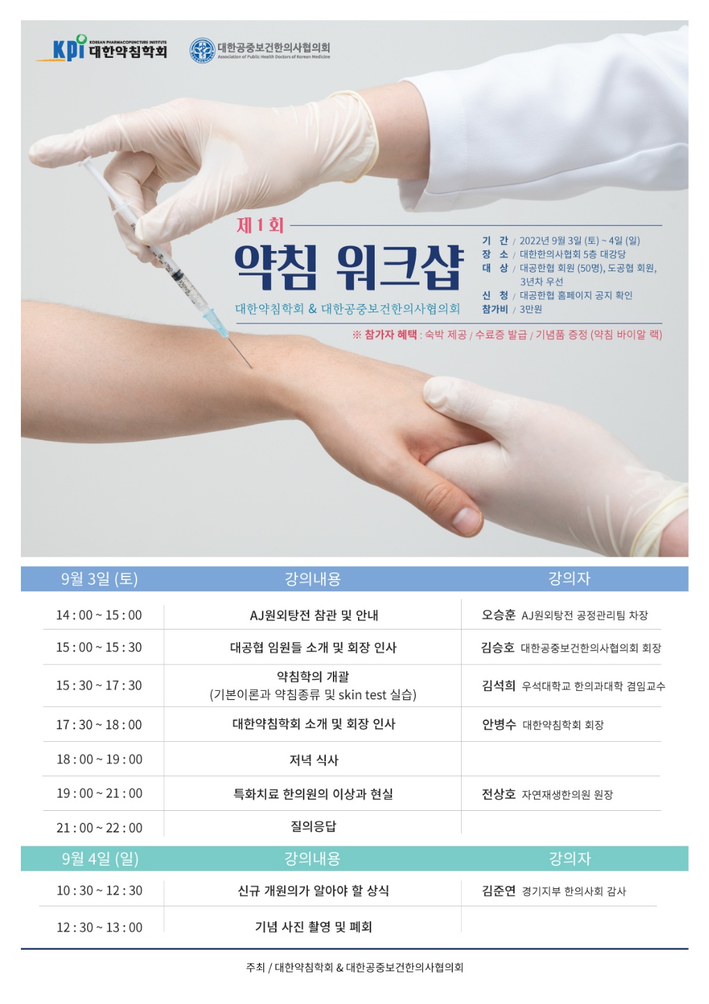 대한약침학회와 대한공중보건한의사협의회가 공동으로 9월 3~4일 양일간 대한한의사협회관 5층 대강당에서 제1회 약침 워크샵을 개최한다.