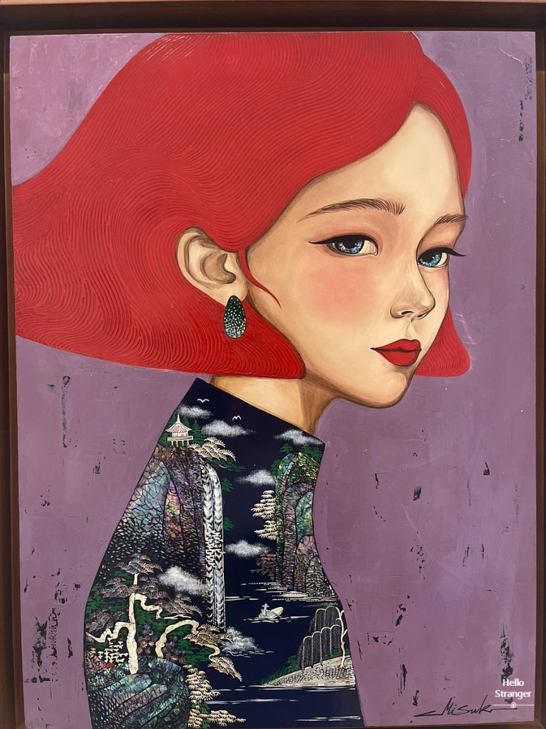 언급했듯이 그녀는 동양화를 전공했고 초반에 여인들의 옷에 주로 그려져 있던 산수화가 어느덧 그녀들의 머리를 장식하면서 좀 더 섬세한 기법, 좀 더 뛰어난 도상, 좀 더 밀도 있는 이야기들이 보이기 시작한다. 최근에는 그 산수화를 자개공예로 표현하기 시작하면서 작품들은 말 그대로 날개를 달고 있다.