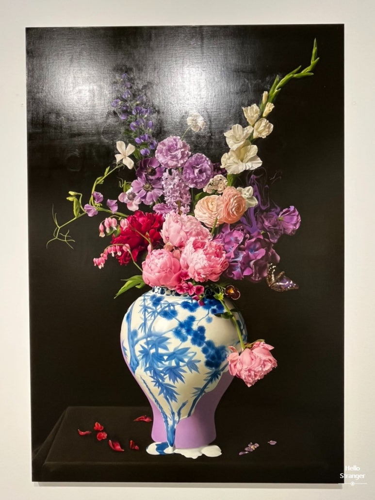 수없이 보아왔지만 그때까지만 해도 가장 시시하다고 생각했던 게 꽃그림이었는데 꽃을 그린 작품이 이렇게 전율을 선사할 수 있다는 것을 그 때 처음 알게 되었다. 보이는대로 잘 그리기만 한다면 극사실주의와 뭐가 다르냐 싶은데 잘 그리는 것에 더해 설명할 수 없는 아우라가 느껴진다. 그의 꽃 정물화는 그저 아름답다를 넘어 그 자리에서 발걸음을 차마 뗄 수 없게 만드는 힘이 있었다. 아마도 고전주의 회화에서 영감을 받아 차용한 정물화 기법과 17세기 플랑드르에서 성행했던 바니타스적 요소인 시들어가는 꽃과 벌레등의 디테일 때문인지 종교적인 느낌을 많이 받았던 것 같다.