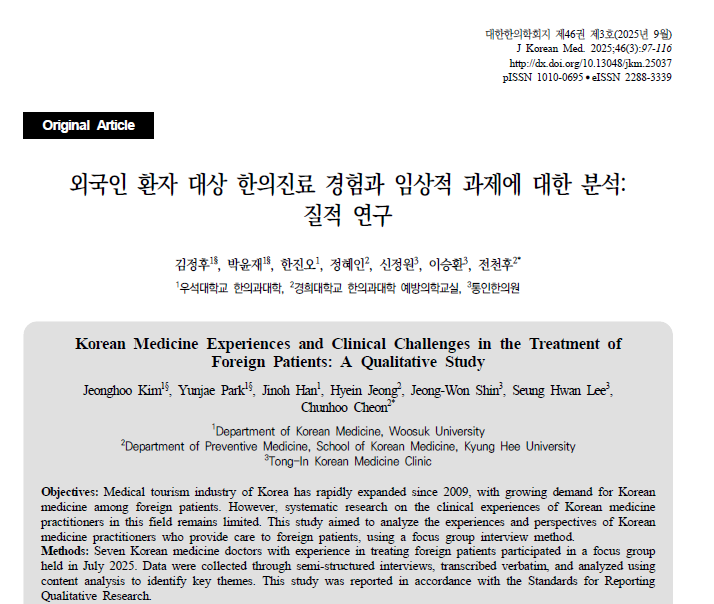 국내 한의사의 외국인 환자 진료 경험과 현장 과제를 분석한 연구 논문이 대한한의학회지 2025년 9월호에 발표됐다. 이번 논문은 한국한의약진흥원 외국인환자 유치 활성화 사업의 일환으로, 통인한의원(신정원·이승환 원장)이 기획하고 경희대 예방의학교실(전천후 교수, 정혜인 연구원)과 우석대 재학생(김정후, 박윤재, 한진오)의 협력으로 완성됐다.