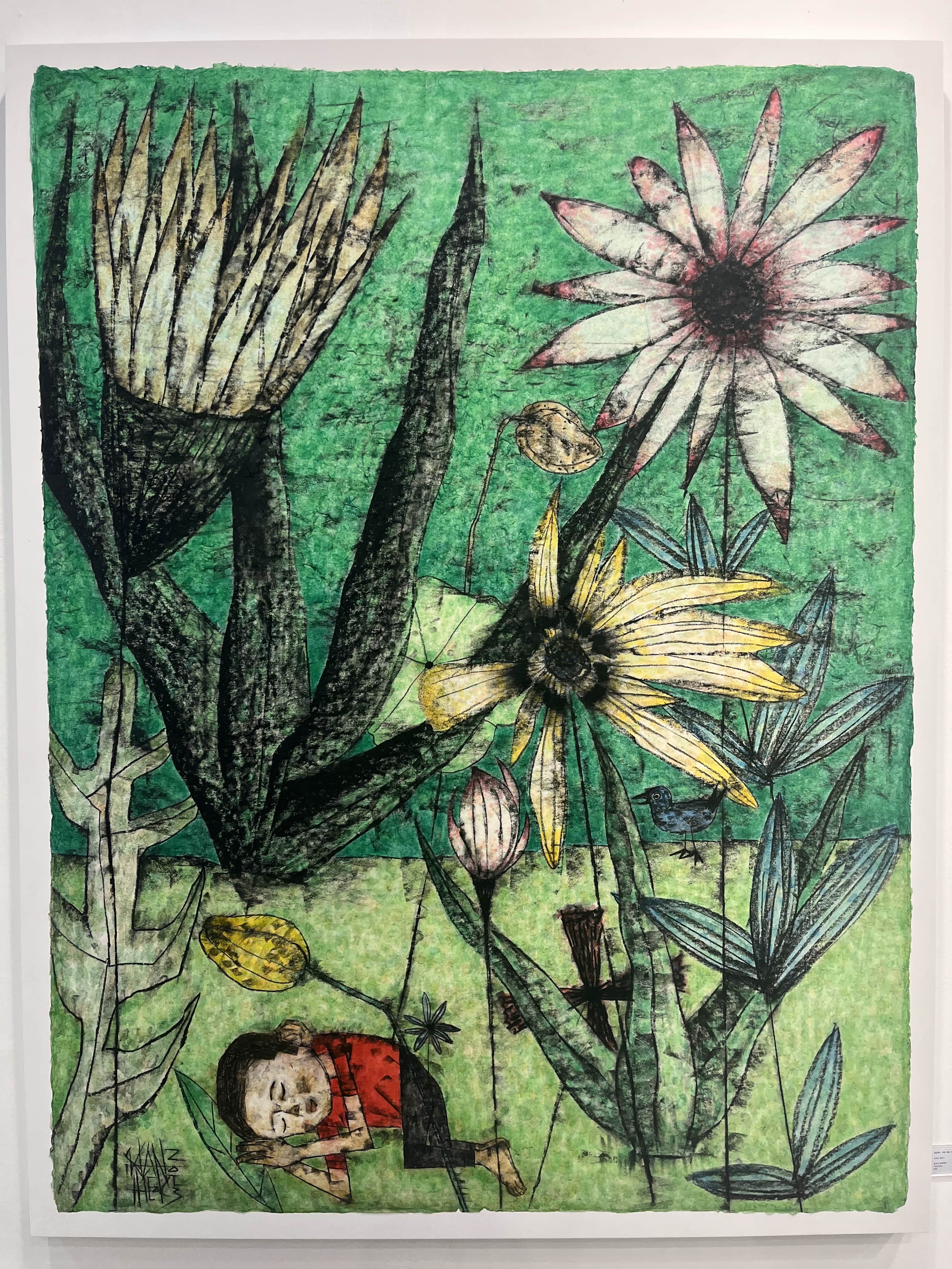 매년 키아프를 방문할 때마다 가장 먼저 들르는 부스는 38년 전통의 청화랑이다. 2021년 화랑미술제에서 인연을 맺은 임만혁 작가의 작품을 보기 위해서이다. 임만혁은 고향 강릉에서 가족, 동물, 바다 풍경을 주제로 작업하며, 서양화와 동양화를 동시에 전공한 이력으로 독특한 화풍을 선보인다. 한지에 목탄으로 밑그림을 그린 후 전통안료로 채색하는데 예전 작업들을 보면 뒤틀리고 왜곡된 신체 표현에 어딘지 모르게 불안과 우울이 깃든 인물화들이 주를 이루었다. 근작에서는 한결 편안해진 표정과 안정된 구도의 인물들이 등장한다. 이번 키아프에서는 꽃밭 안에 잠든 소년을 그린 작품 <녹색의 밤>을 선보였다. 비현실적으로 크게 그려진 꽃들은 소년이 꾸고 있는 꿈일 수도, 아니면 우리가 자는 동안에도 변함없이 생동하는 자연을 나타내는 것일 수도 있다. 인물과 동물을 주로 그리는 그가 간혹 선보이는 꽃을 그린 작품들에서 사람들은 유독 작게, 그리고 자는 모습으로 등장한다. 쭉 뻗은 직선 위주의 필치 때문에 꽃조차 다소 날카로워 보일 수 있지만, 작품 전체에서 느껴지는 감싸는 듯한 따뜻함은, 작가의 고향 강릉에 대한 애틋함과 결혼 후 찾은 삶의 안정이 고스란히 반영된 결과다.