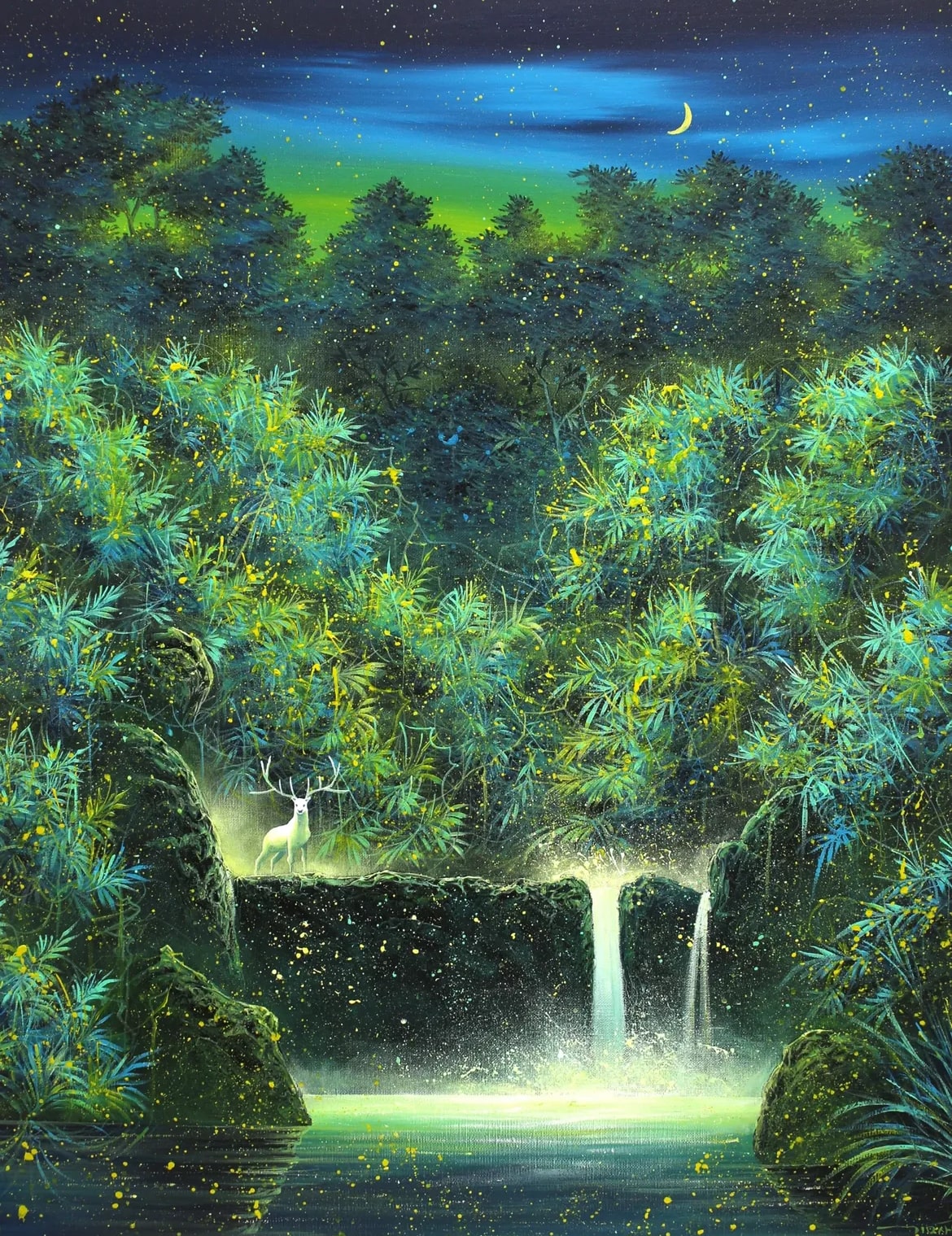 만물이 깨어나는 시간인 새벽의 촉촉함, 그의 작품에는 처음 등장한 달과 곶자왈이 품고 있는 물을 역동적으로 표현한 폭포, 깊고 푸른 자연 속에서 결코 과시하지 않지만 당당한 존재감을 드러내는 백록, 드리핑 기법으로 표현된 반딧불이는 하늘까지 수놓여 별이 되었다. 놓칠 수 없는 작품이었다.