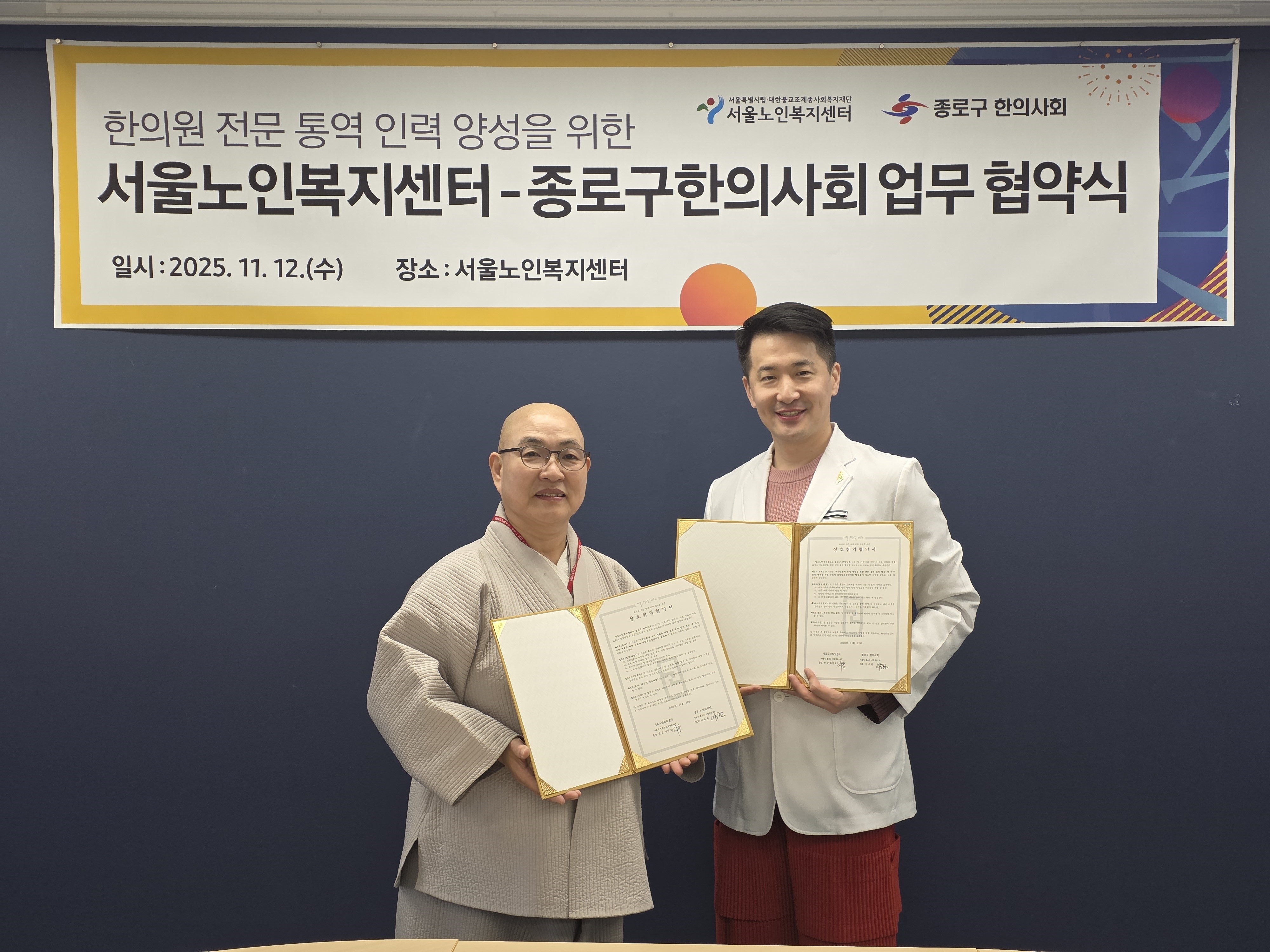 서울노인복지센터(관장 지웅 스님)와 종로구한의사회(회장 이승환)가 11월 12일 한의의료기관에서 외국인 환자 서비스를 활성화하고, 시니어 인력의 새로운 일자리 창출을 위한 업무협약을 체결했다. 이번 협약은 영어 소통이 가능한 60세 이상 노인을 대상으로 한의원 전문 통역 인력 양성 교육 및 취업 연계를 지원하는 것이 목적이다.