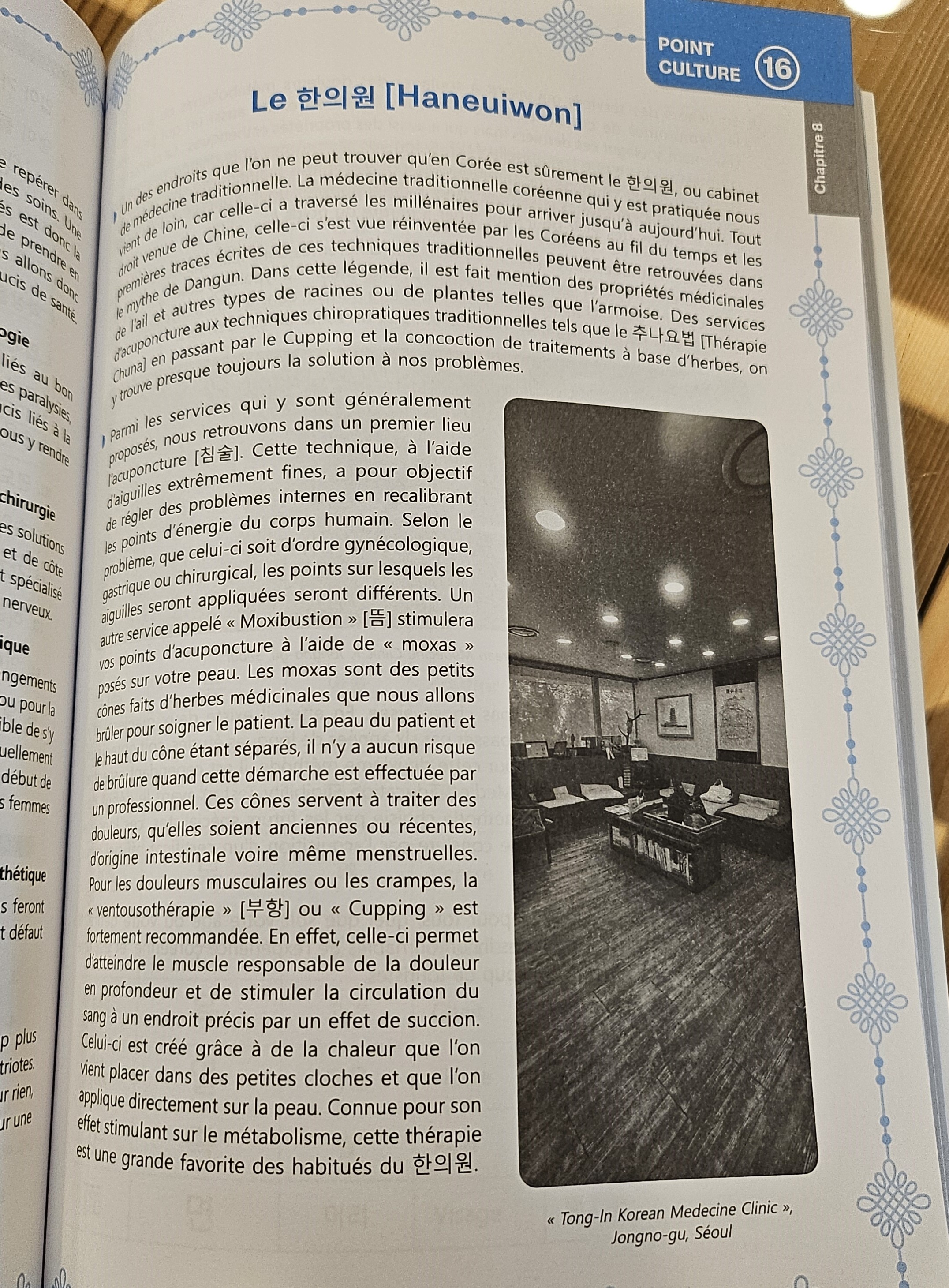 이번 학습서에서 가장 눈길을 끄는 대목은 한국의 의료기관인 ‘한의원’과 그 치료 과정을 비중 있게 다룬 부분이다. 저자인 아델라드 루세나 김은 2024년 5월 서울의 한 유명 한의원을 직접 방문해 침 치료, 부항, 약침, 그리고 척추와 관절을 교정하는 추나 치료까지 직접 체험했다. 책의 137~138페이지에는 당시의 생생한 진료 기록과 사진이 수록되었으며, 한의학 전문가와의 인터뷰를 통해 프랑스인들에게는 다소 생소할 수 있는 한의학의 원리와 치료 효과를 알기 쉽게 설명하고 있다.