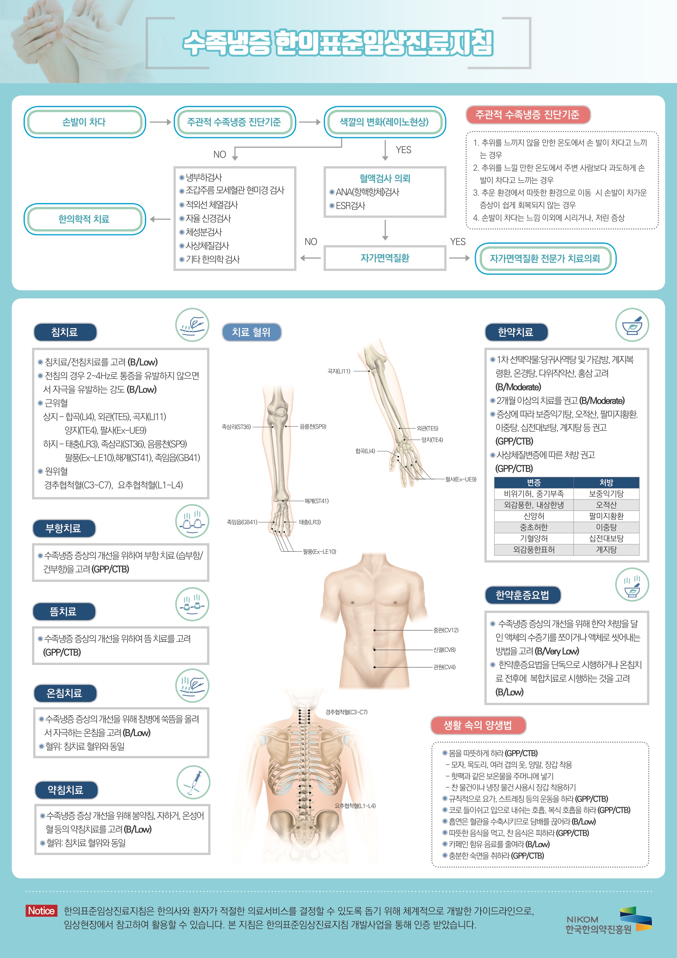 한의학에서는 이러한 상태를 ‘양기 부족’ 혹은 ‘기혈 순환의 저하’로 설명한다. 몸을 따뜻하게 하고 기운을 밖으로 퍼지게 하는 양기가 부족해지면, 중심부의 온기가 말단까지 전달되지 못한다. 그 결과 손과 발이 쉽게 차가워진다. 또한 스트레스나 피로처럼 일상적인 요인들도 기혈의 흐름을 막아 이러한 상태를 악화시킬 수 있다. 이러한 관점에서 수족냉증은 단순한 불편함이 아니라, 몸의 균형이 흔들리고 있다는 신호로 볼 수 있다. 그래서 한의학에서는 단순히 ‘따뜻하게 한다’는 접근을 넘어서, 몸의 흐름 자체를 회복시키는 데 초점을 둔다. 실제 한의표준임상진료지침에서도 다양한 치료 방법이 제시되는데, 그중에서도 대표적인 방법은 한약과 침·뜸 치료이다.