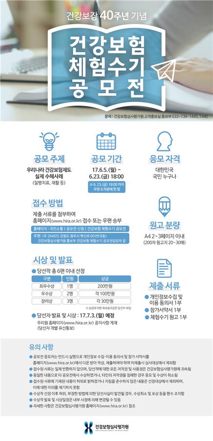 건강보험심사평가원(원장 김승택, 이하 ‘심사평가원’)은 건강보장 도입 40주년을 맞아「건강보험 체험수기 공모전」을 개최한다.