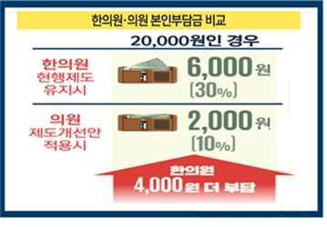 - 그러므로 내년부터 환자가 투약 없이 총 진료비가 2만원인 경우 한의원에서 6,000원을 부담하게 되어 한의원의 문턱이 지금보다 3배나 높아지는 주장은 사실이며, 한의원을 이용하는 어르신은 의원 대비 4,000원을 더 부담하셔야 합니다.